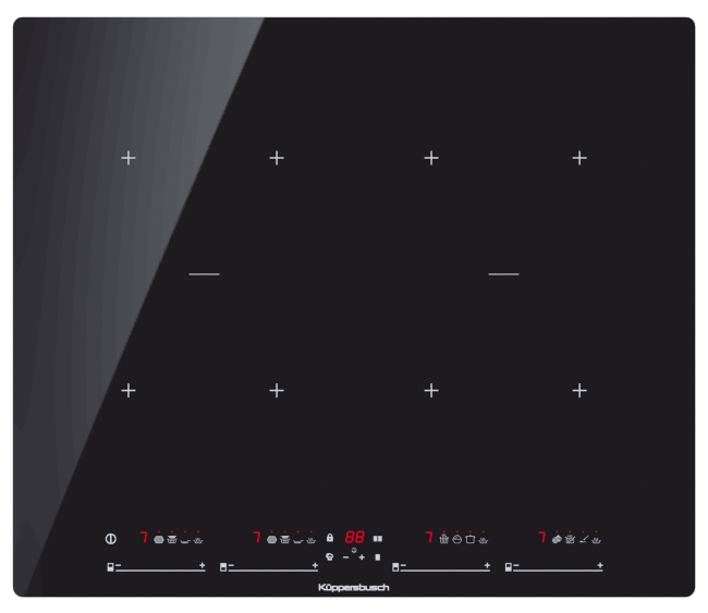 - 4 варочных зоны 262,5 x 195 мм / 2400 Вт (3700 Вт*)