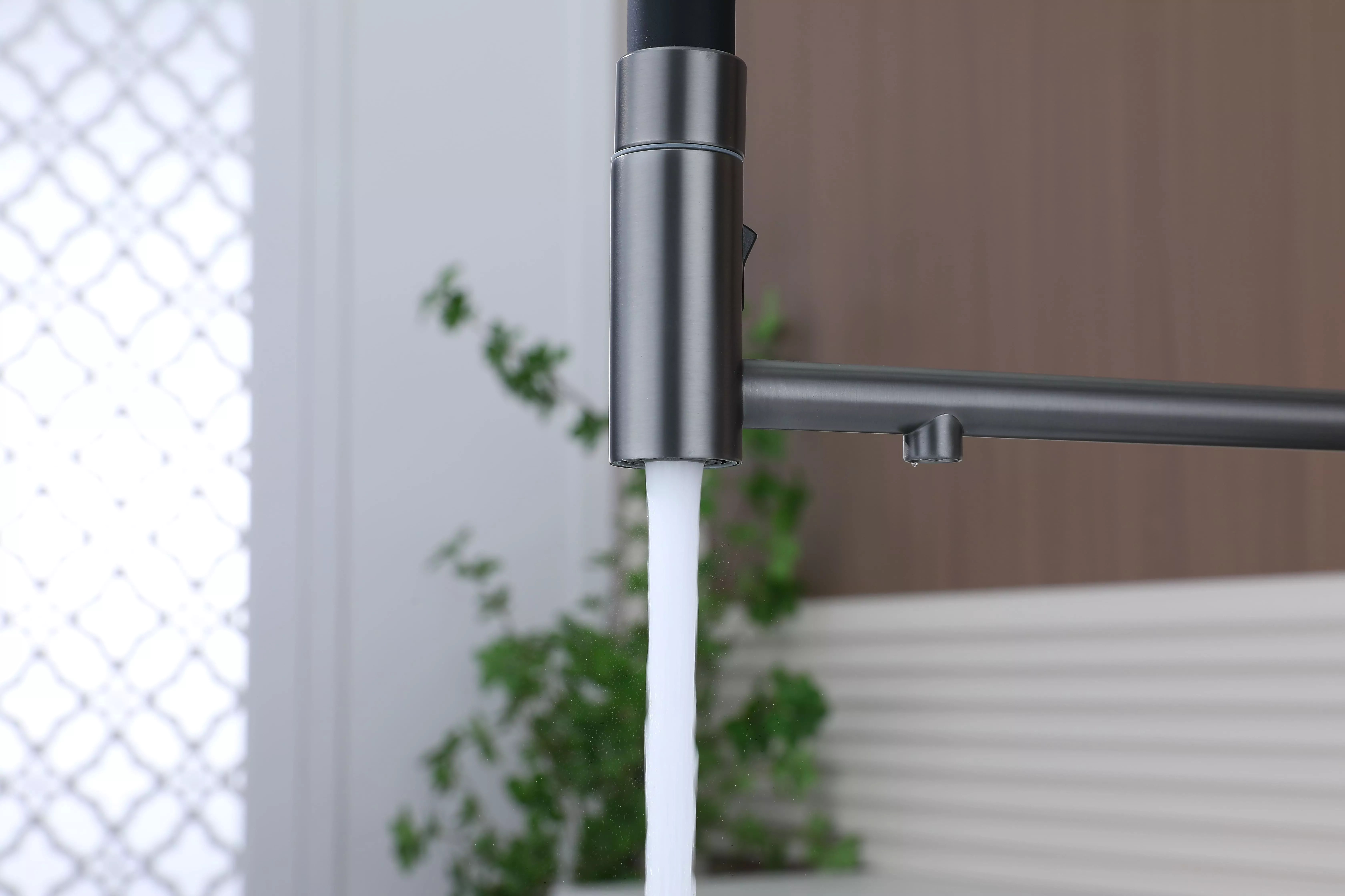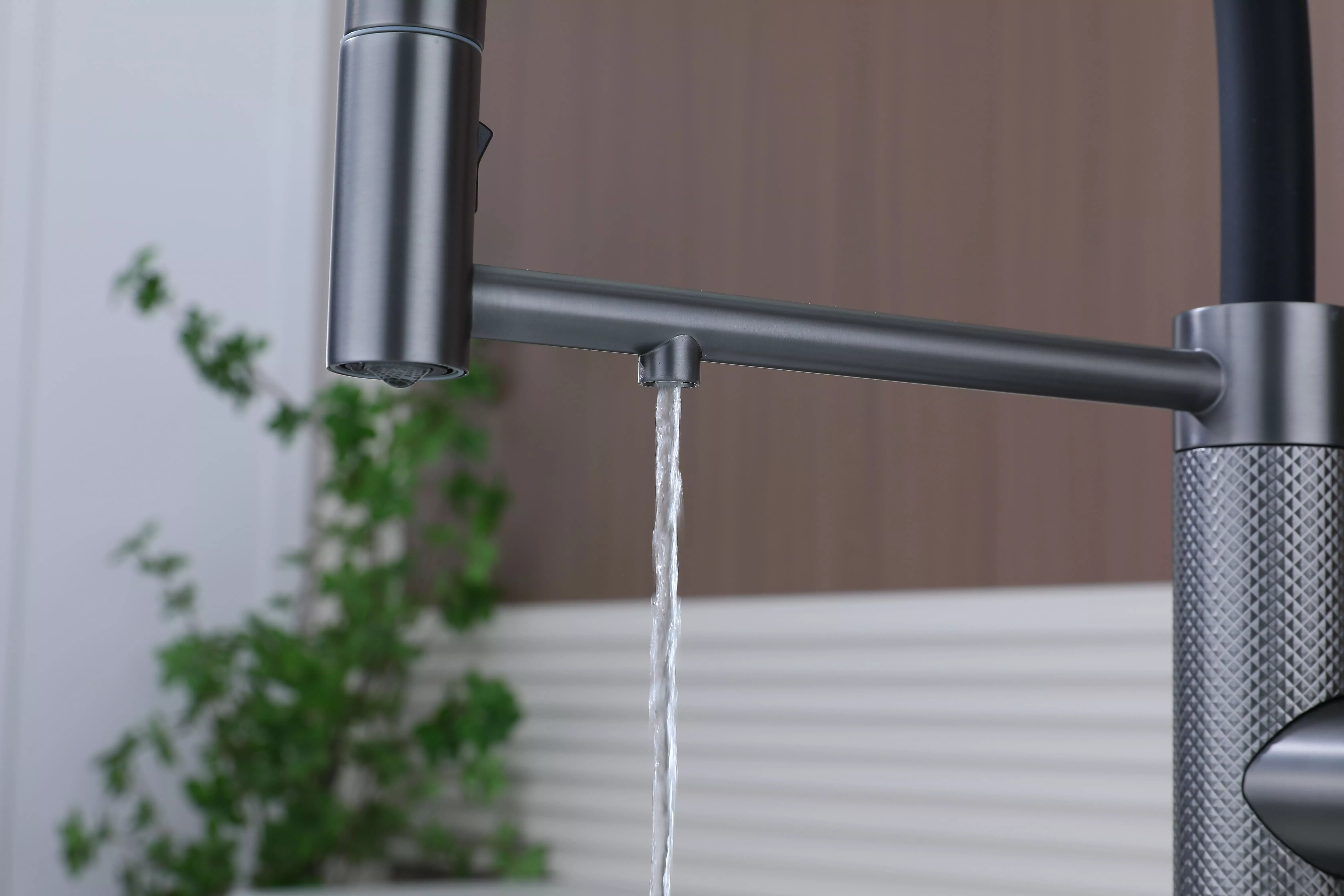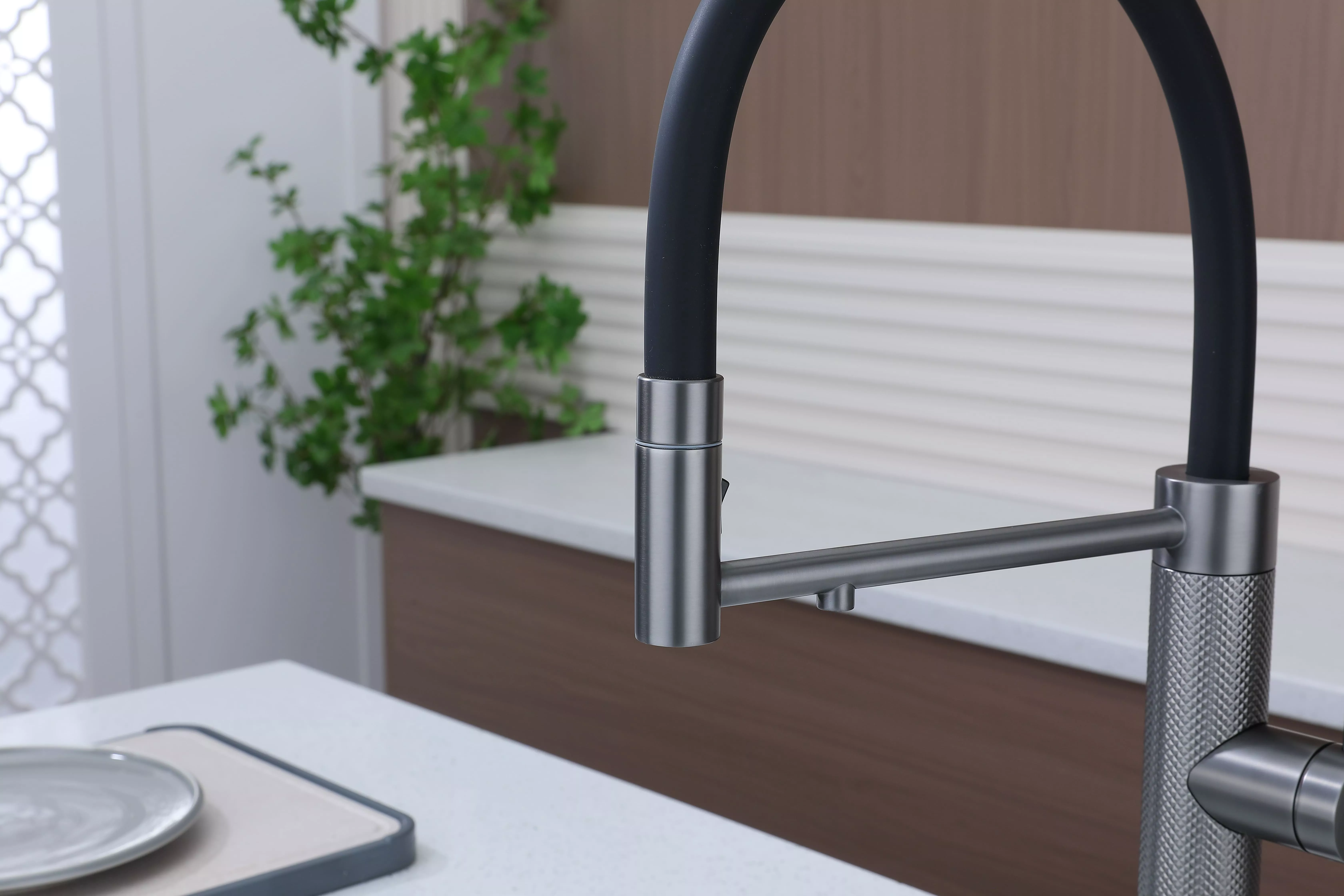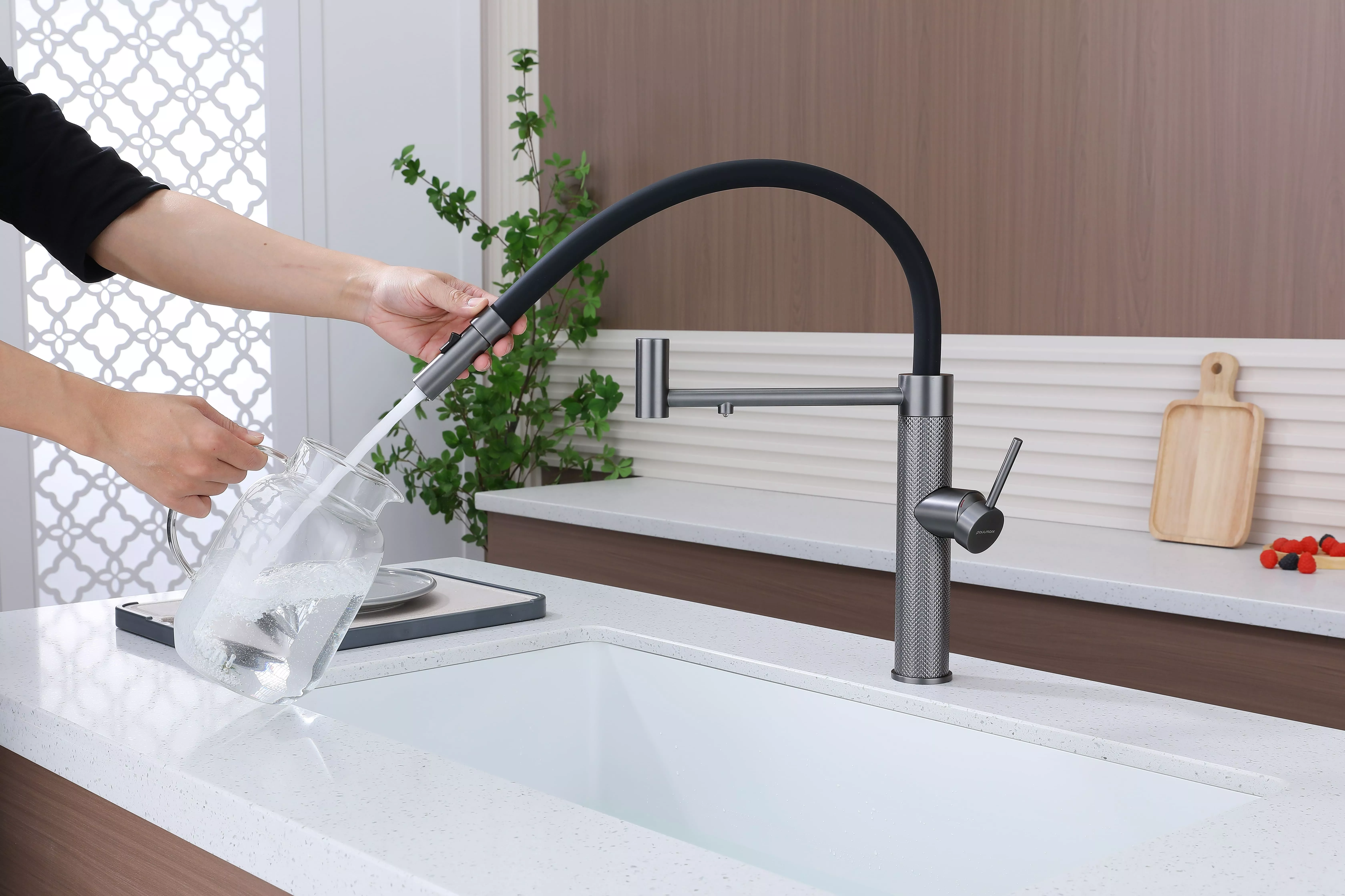 Смеситель для кухни GANYMEDE DIAMOND сочетает в себе стильный дизайн и передовые технологии. Благодаря функции подключения фильтра питьевой воды и специальной технологии Trinkwasser® водопроводная и очищенная вода никогда не смешиваются, а управление ими осуществляется единым удобным рычагом 2в1. Гибкий силиконовый излив обеспечивает широкий диапазон движений и надежно фиксируется элементом корпуса в форме кольца. На конце излива расположена кнопка для переключения между режимами струи и душа, что идеально подходит для мытья посуды и продуктов. Декоративные насечки на корпусе создают игру света и делают модель эксклюзивной. Излив поворачивается на 360°, а расширенная гарантия производителя составляет 8 лет.